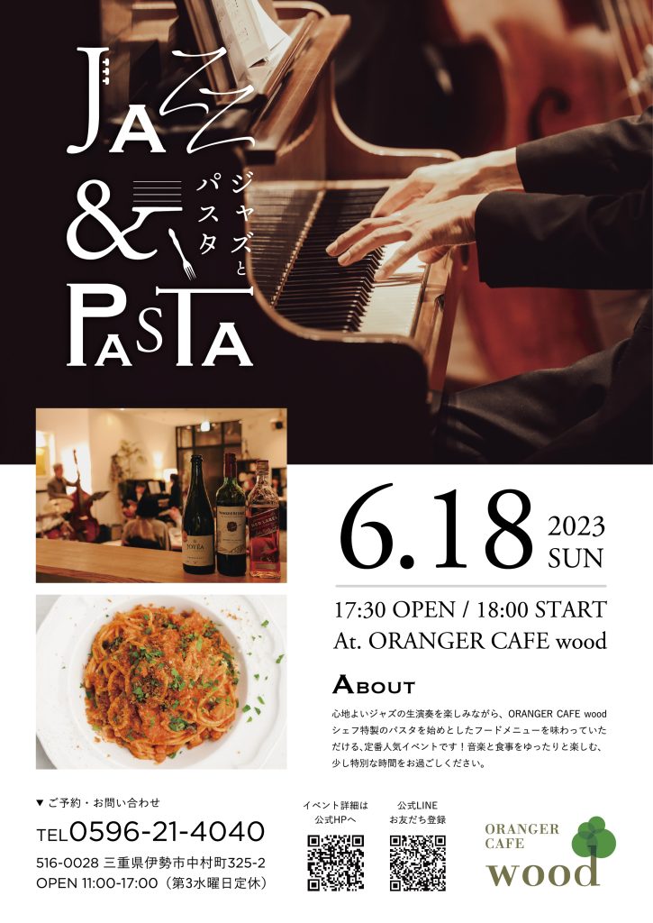 心地よいジャズの生演奏に耳を傾けながら、当店オリジナルのパスタを味わっていただける、ORANGER CAFE wood定番のイベントです。よりお食事もお楽しみいただけるよう、パスタ以外にも、グリル料理などのメニューもご用意しております。ぜひ、音楽と食事をゆったりと楽しみください。