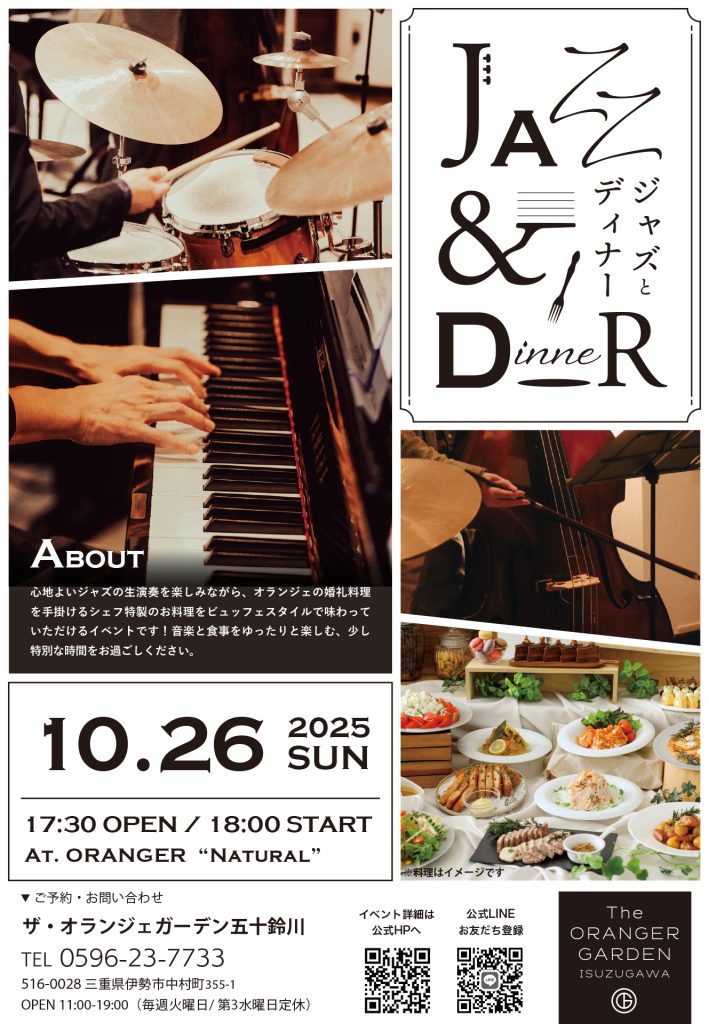 ORANGER CAFE wood 定番人気イベント「ジャズ&パスタ」。10月からは新たに「JAZZ&ディナー」として会場をグリーンガーデンに移し皆様をお迎えいたします。 婚礼料理を手がけるシェフの特別なディナーとともに、心踊るジャズミュージックをお届け。2025年秋の夜は、音楽とお食事を楽しむ特別な時間を、大切な方とオランジェでお過ごしください。